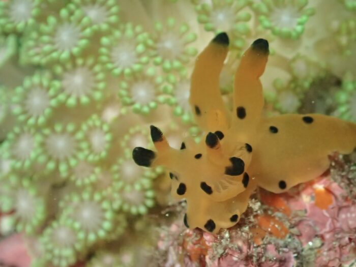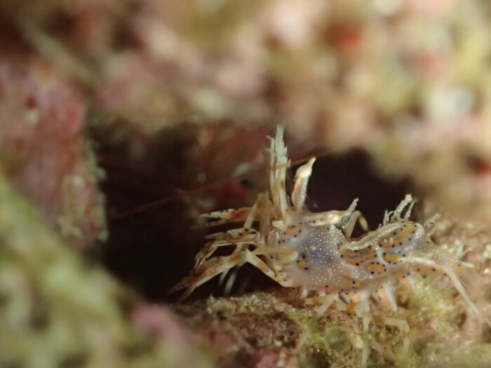ウミウサギに乗るウミウシカクレエビ