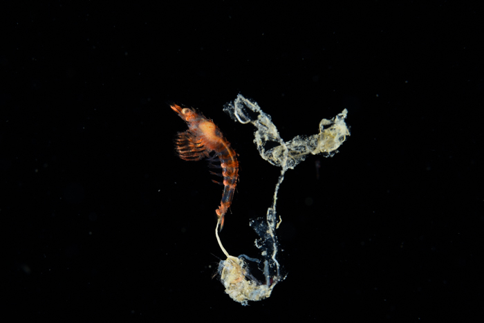 クダヒゲエビのゾエア幼生 後ろの茶色は排泄物です。
