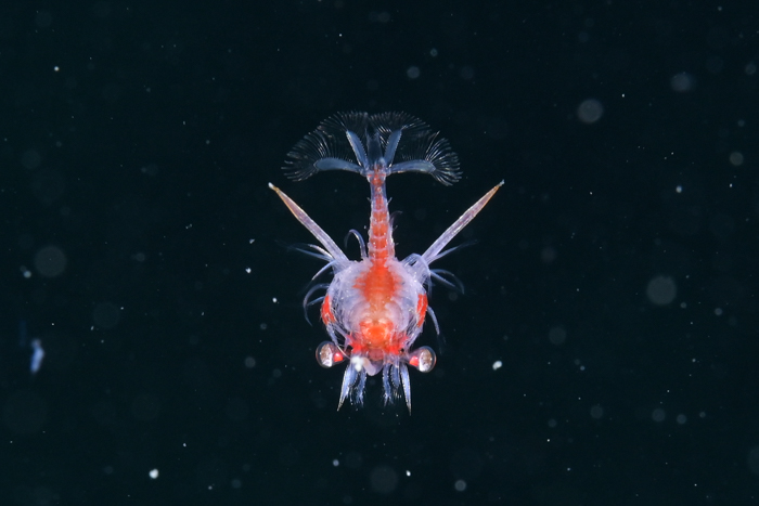 真っ赤なクダヒゲエビの仲間のゾエア幼生や1センチほどのマトウダイの幼魚、