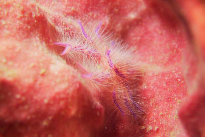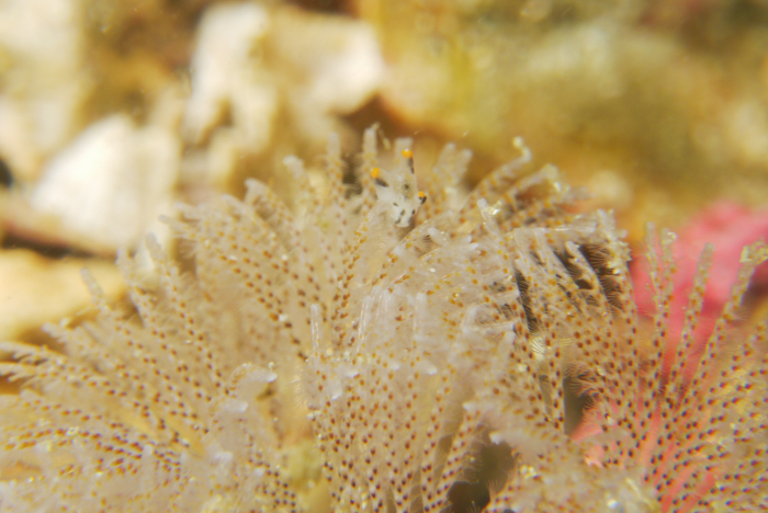 イバラカンザシからイバラカンザシに飛び移ってたタテジマヘビギンポ