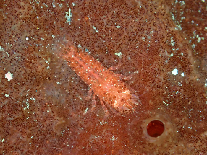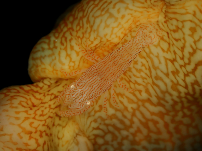 隣のイソギンチャクに移り色が変わったアヤトリカクレエビ