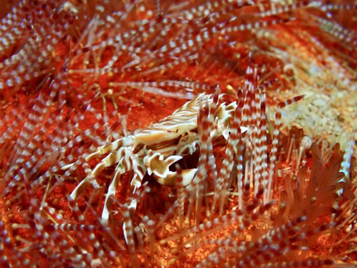 猛毒のウニイイジマフクロウニの上にゼブラガニ